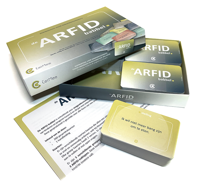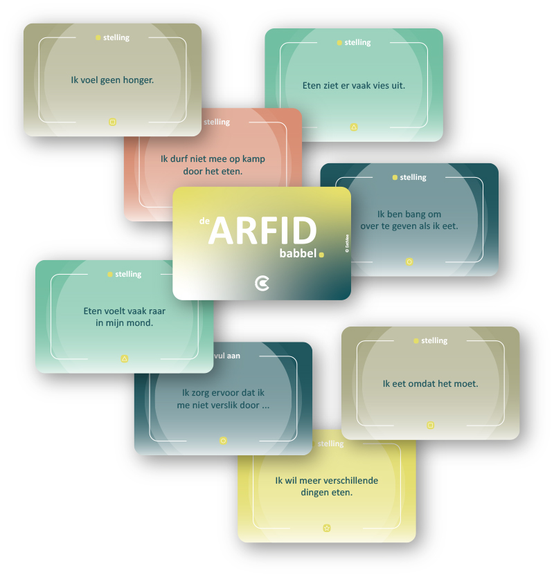 De ARFID-babbel is dé eerste gesprekstool rond ARFID. Deze kaartenset is speciaal ontwikkeld voor hulpverleners die werken met kinderen en jongeren van 6 tot 18 jaar met eetproblemen en (een vermoeden van) ARFID.
